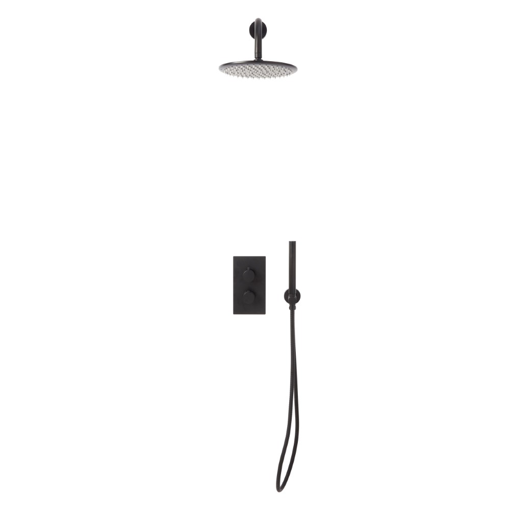 Core Black Twin Round handle, 2 outlet concealed valve with diverter. Inc Shower arm, Drench head, Handset & mounting bracket